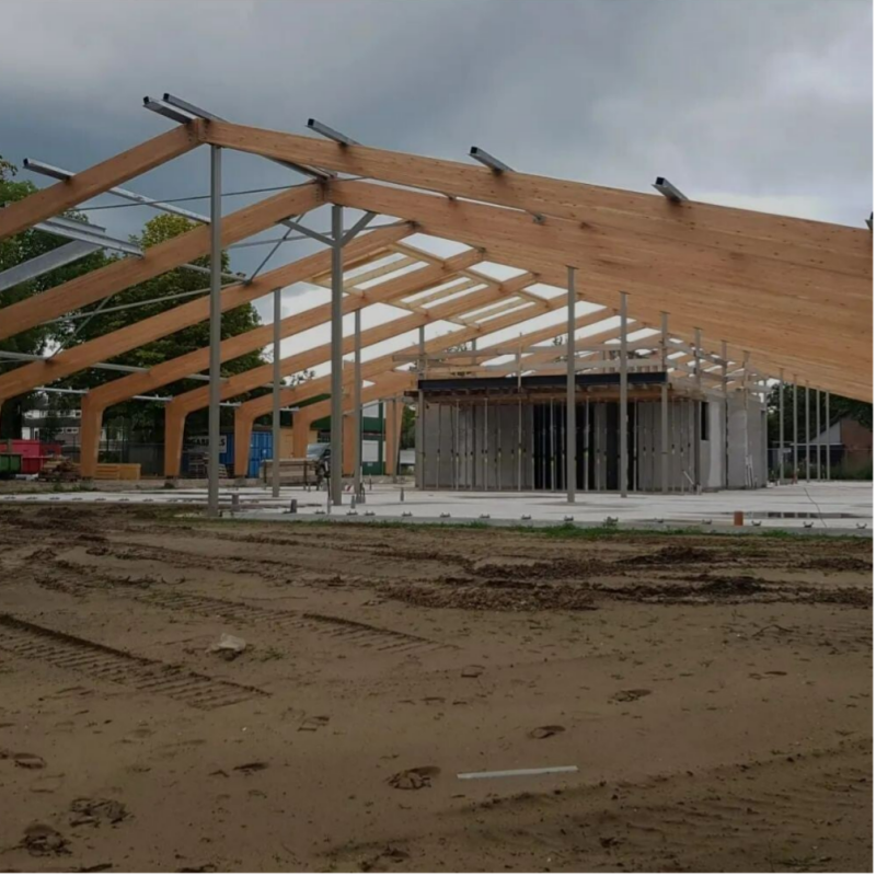 Montage van de gelamineerde houtconstructie en prefab dak/wand en vloerelementen